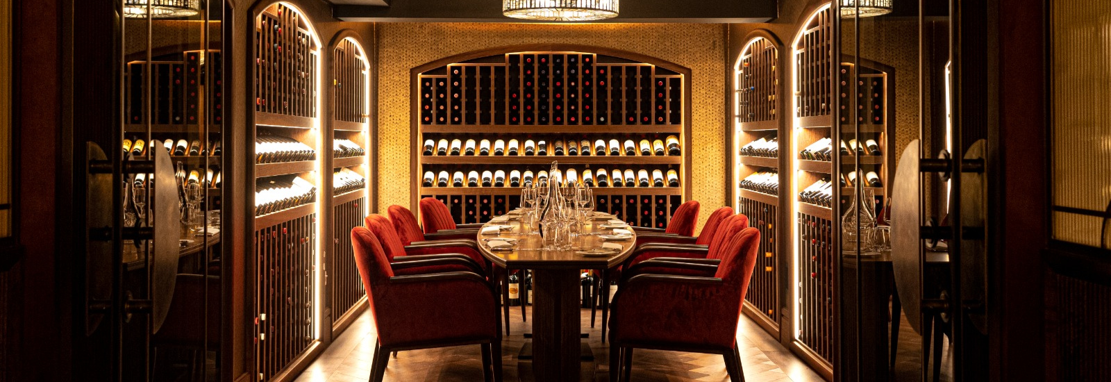Enter our Wine Room, a luxurious space featuring a stunning golden cellar, where rare and exclusive wine bottles line the walls. With seating for up to eight guests, this intimate setting promises an unforgettable experience. A carefully curated wine menu, tailored to your preferences, complements iconic dishes such as our signature Beef Wellington.